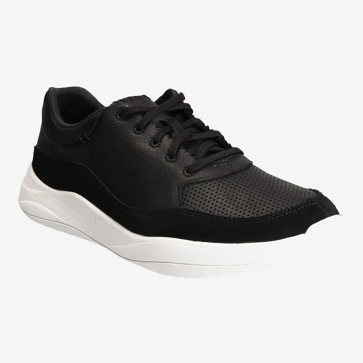 Past can lead to new ideas. This modern model with an athleisure look was inspired by a design from the Clarks archive. The full-grain, black premium leather sneaker with a classic athletic shoe profile and authentic decorative stitching proves to be particularly durable thanks to a robust rubber sole. The micro-perforations and suede create a beautiful contrast in the finishes. The lightweight EVA midsole, Cushion Max™ technology and genuine leather insole guarantee you optimum comfort
